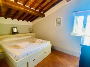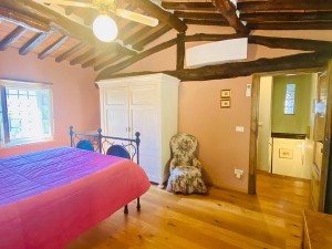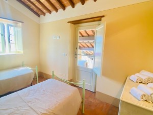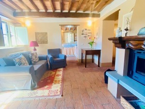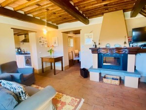 Secondo Rustico : soggiorno con caminetto, sala da pranzo, cucina con porta che apre verso patio esterno , un bagno e una comoda lavanderia. Al piano primo troviamo due camere da letto (di cui una con terrazzo con vista panoramica) e un bagno