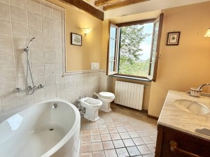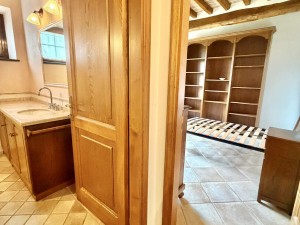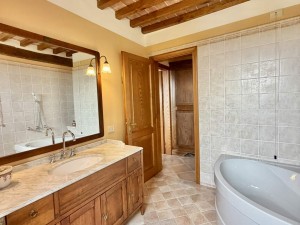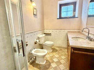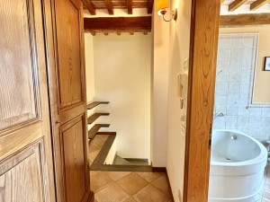 Al primo piano si trova la seconda camera matrimoniale e un bagno con vasca idromassaggio, ideale per concedersi momenti di puro relax. Le finestre regalano una splendida vista sulle montagne circostanti, creando un’atmosfera di pace e armonia con la natura.